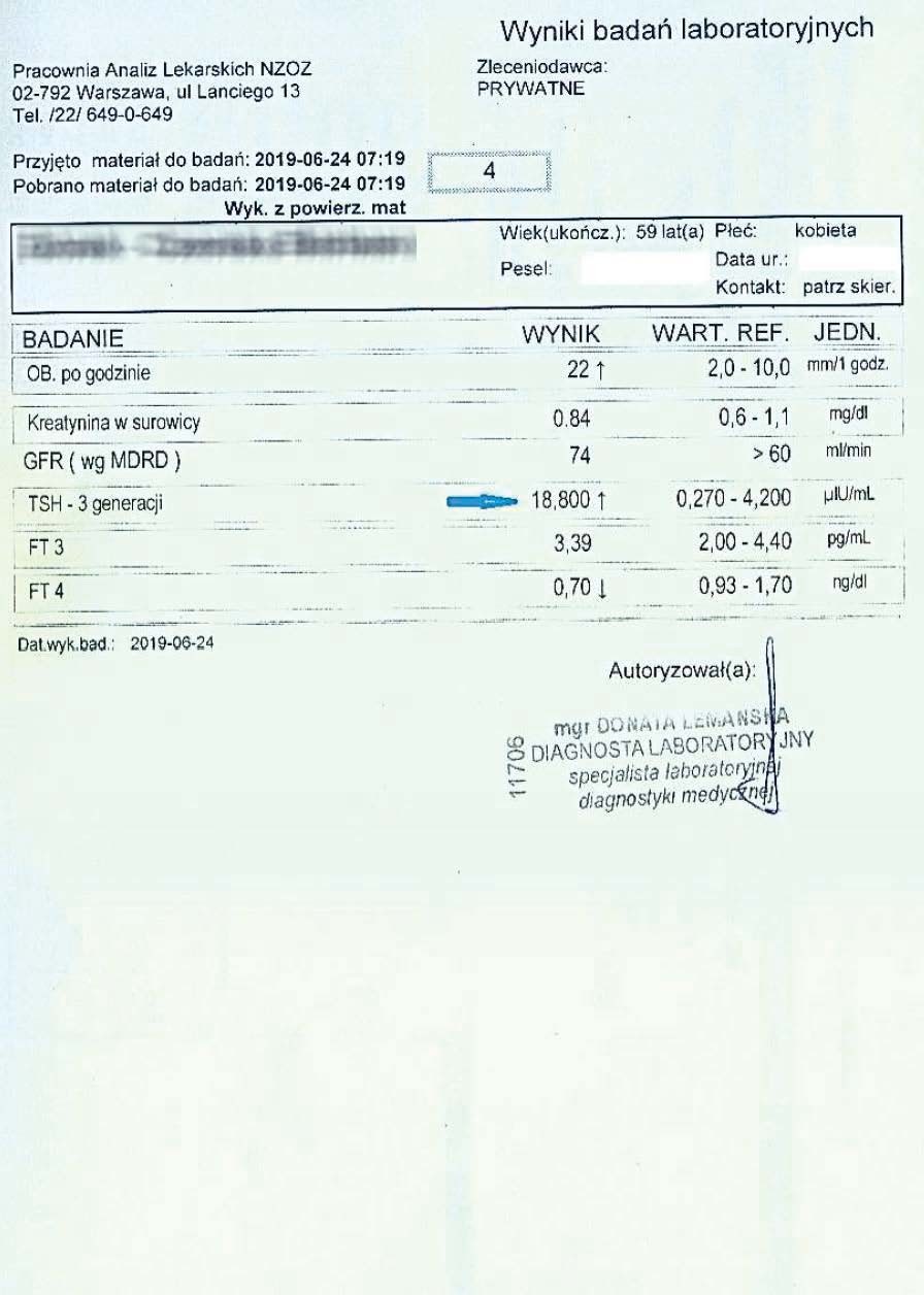 Kobieta lat 59 z niedoczynnoscią tarczycy, bez przyjmowania lewotyroksyny. Kobieta przyjmowała preparat przez okres ponad 3 miesięcy. Przy zachowaniu naturalnego cyklu komórkowego i stałemu stymulowaniu mitochondriów osiągneła następujące wyniki kuracji: