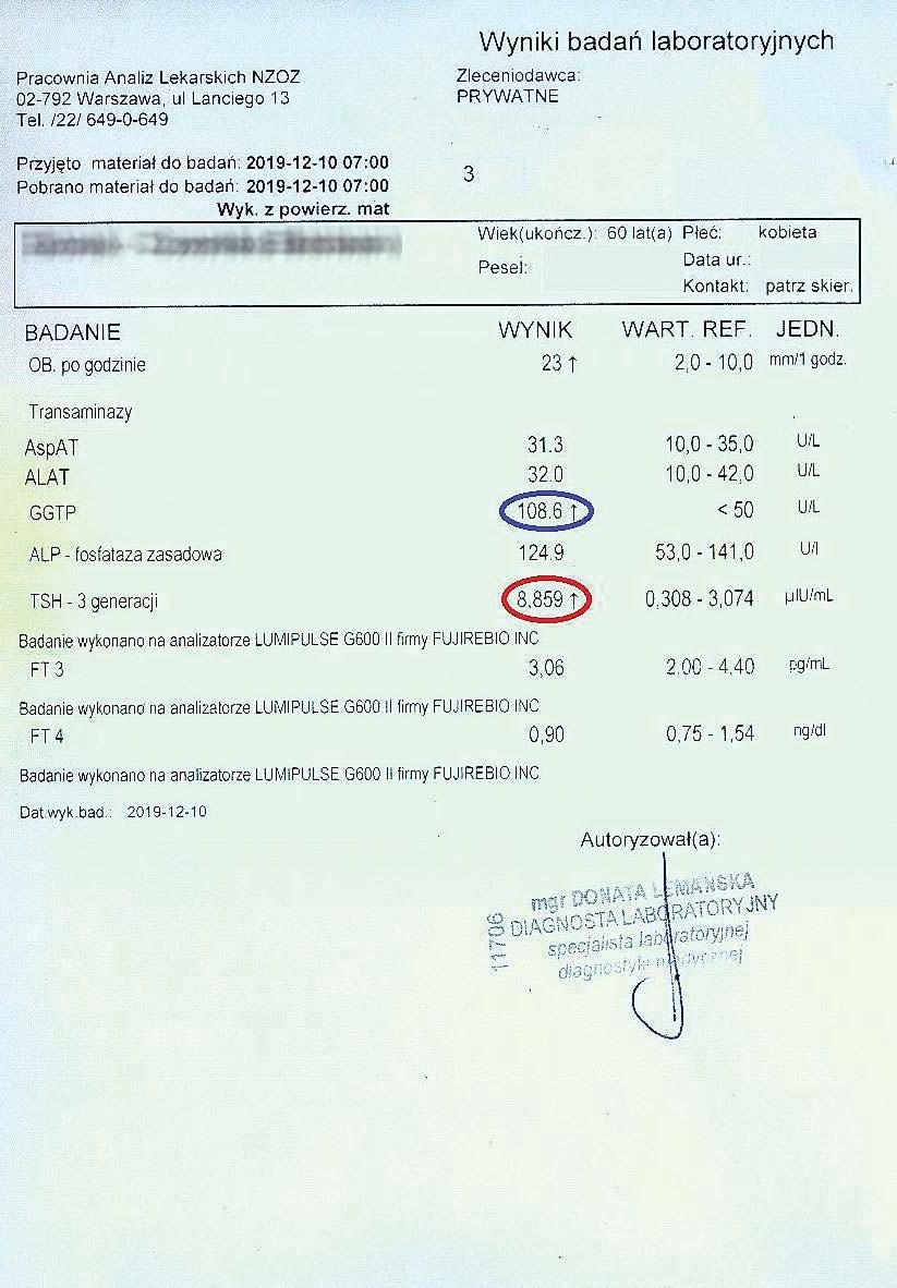 Po kolejnych dwóch miesiącach kobieta ponownie wykonała badania. Widoczne są: spadek TSH, obniżenie stanu zapalnego jak i spadek markeru wątrobowego GGTP.
