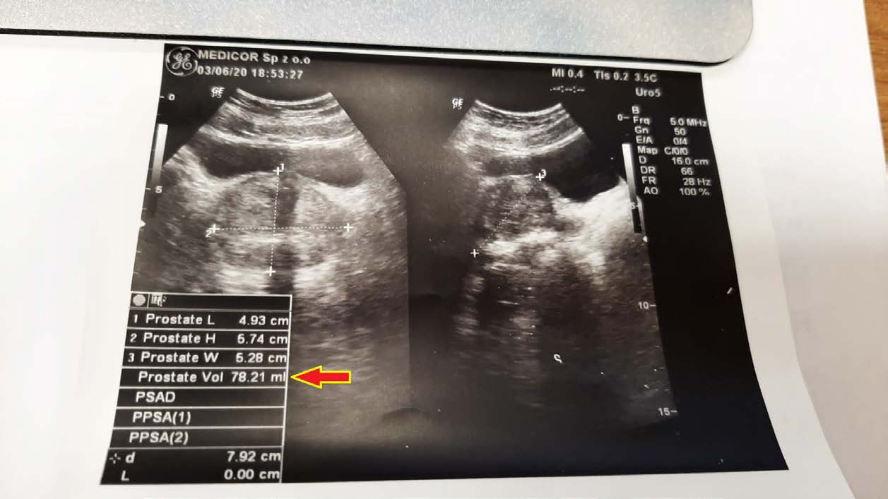 Mężczyzna lat 50 z przerostem gruczołu krokowego, mimo iż to łagodna hiperplazja, odczuwał ból i dyskomfort przy oddawaniu moczu. Objętość gruczołu krokowego w dniu diagnozy wynosiła 78,21 ml (78,21 cm3). Po nieudanych próbach z finasterydem, podjęto próbę zmniejszenia gruczołu preparatem, jak widać ze zdjęć kontrolnych USG z sukcesem – znaczne zmniejszenie już po 2,5 miesiąca terapii do 55,97 ml (55,97 cm3).